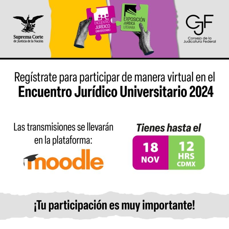 Suprema Corte de Justicia de la NaciónInfografías Regístrate HOY para asistir a todas las transmisiones programadas del Encuentro Jurídico Universitario y la Exposición Jurídica Literaria. Por Araceli Bastida - noviembre 18, 2024 0 FacebookTwitterPinterestLinkedinReddItEmailWhatsAppTelegramVK