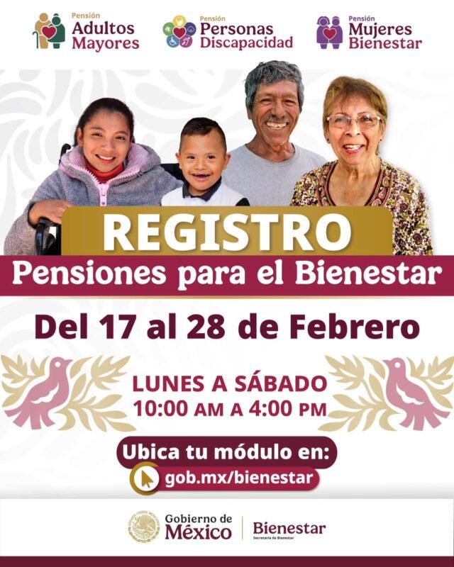La secretaria de Bienestar, Ariadna Montiel Reyes, informó que, el 28 de febrero concluye el registro a la Pensión para el Bienestar de las Personas Adultas Mayores de 65 años; Pensión para el Bienestar de las Personas con Discapacidad de 0 a 64 años; y Pensión Mujeres Bienestar, que tienen o cumplen entre enero y febrero 63 años.