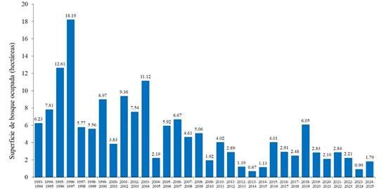 Superficie de bosque ocupada por colonias de mariposas Monarca en México desde 1993-1994 a 2024-2025.