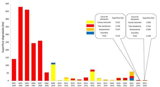Degradación forestal en la zona núcleo de la Reserva de la Biosfera Mariposa Monarca, RBMM (2001-2024).