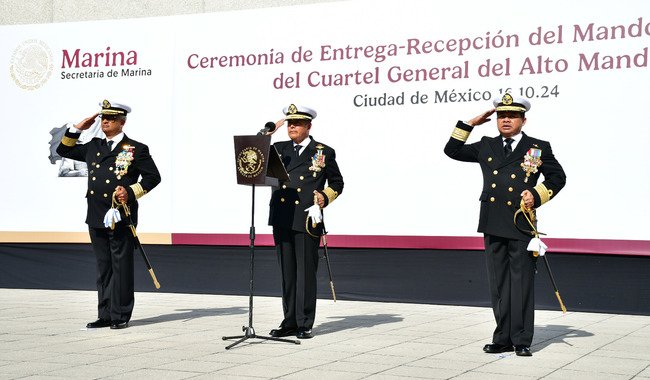 Ciudad de México a 16 de Octubre de 2024.- La Secretaría de Marina a través de la Armada de México, informa que hoy, se llevó a cabo la Ceremonia de Entrega-Recepción del Mando de Armas del Cuartel General del Alto Mando, por acuerdo de la Comandanta Suprema de las Fuerzas Armadas; esto como parte de la rotación permanente del personal y con la finalidad de que esta Institución continúe con el cumplimiento de su misión y atribuciones.