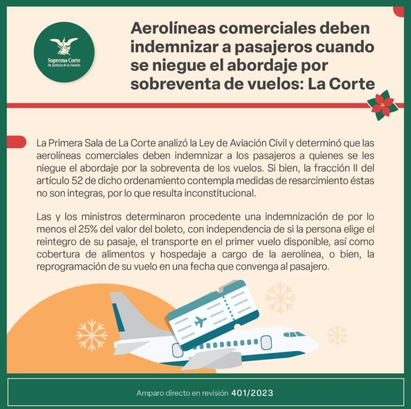 Suprema Corte de Justicia de la NaciónInfografías ¿Sobrevendieron tu vuelo? #LaCorte resolvió que las aerolíneas deben indemnizar a los pasajeros afectados con al menos el 25% del costo del boleto. Por Araceli Bastida - diciembre 22, 2024 0 FacebookTwitterPinterestLinkedinReddItEmailWhatsAppTelegramVK