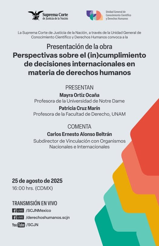 Suprema Corte de Justicia de la NaciónInfografías Te invitamos a la presentación de la obra «Perspectivas sobre el (in)cumplimiento de decisiones internacionales en materia de derechos humanos». Por Araceli Bastida - agosto 22, 2025 0 FacebookTwitterPinterestLinkedinReddItEmailWhatsAppTelegramVK