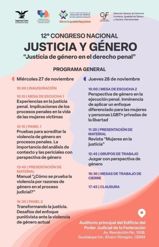 Suprema Corte de Justicia de la NaciónInfografías Te invitamos a participar en el 12º Congreso Nacional Justicia y Género, los días 27 y 28 de noviembre a las 10:00 horas. Por Araceli Bastida - noviembre 22, 2024 0 FacebookTwitterPinterestLinkedinReddItEmailWhatsAppTelegramVK