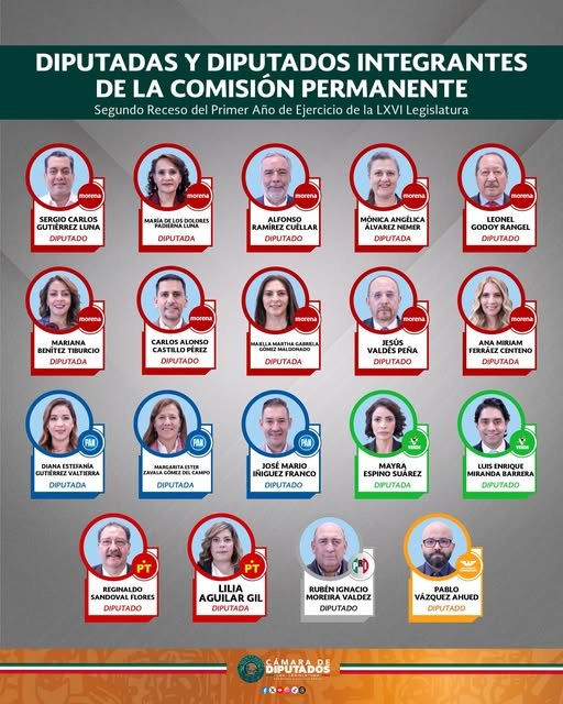 Te presentamos a las 19 diputadas y diputados titulares que integran la #ComisiónPermanente que trabajará durante el Segundo Receso del Primer Año de Ejercicio de la #LXVILegislatura. Ellas y ellos representan la pluralidad de la Cámara de Diputados.