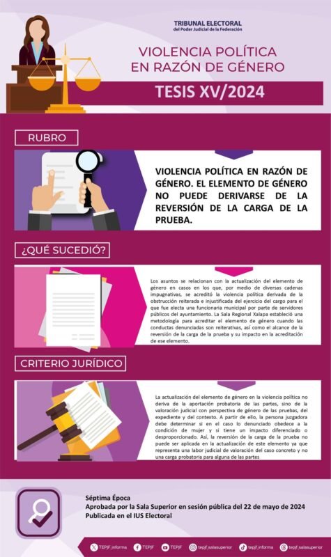 Tesis XV/2024 Rubro: Violencia política en razón de género. El elemento de género no pude derivarse de la reversión de la carga de la prueba.