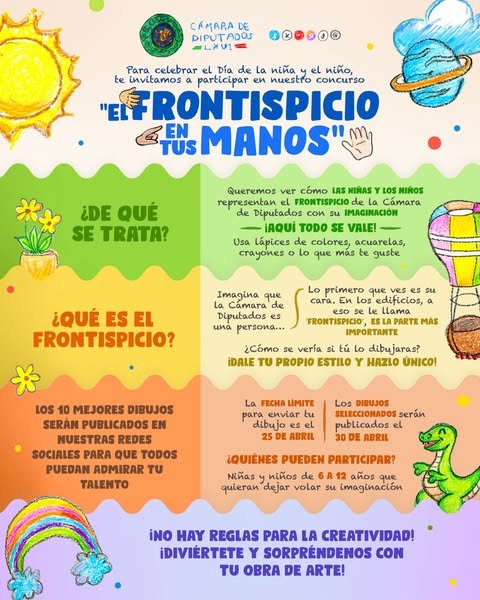 Camara de DiputadosInfografías Tienes entre 6 y 12 años? Participa en el concurso de dibujo “El Frontispicio en tus manos”. Los 10 mejores se publicarán en las redes de la Cámara de Diputados, y los primeros 3 recibirán premios especiales. Por Araceli Bastida - abril 9, 2025 0 FacebookTwitterPinterestLinkedinReddItEmailWhatsAppTelegramVK