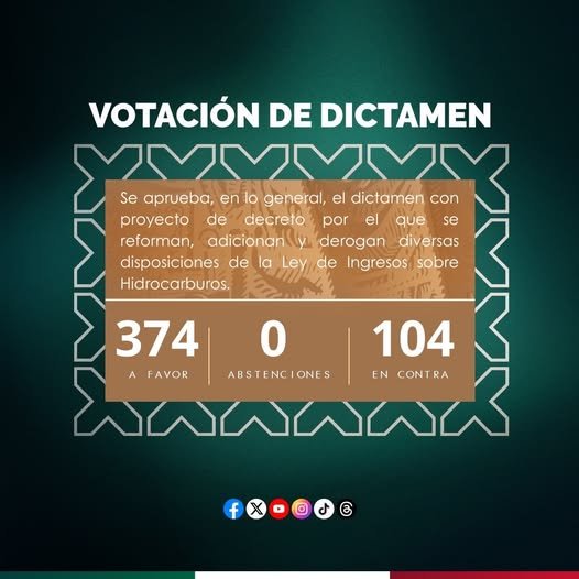 #ÚLTIMAHORA | Queda aprobado, en lo general, el dictamen que reforma, adiciona y deroga diversas disposiciones de la Ley de Ingresos sobre #Hidrocarburos.