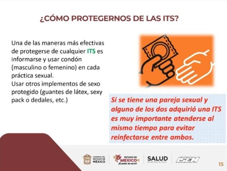 TOLUCA, Estado de México. – Para prevenir el contagio de Infecciones de Transmisión Sexual (ITS) el método más efectivo es la utilización del condón femenino o masculino, aseguró el Doctor Eduardo Salmerón Baca, al dictar la plática “Infecciones de Transmisión Sexual”, ponencia que forma parte del Programa de Salud Materna y Perinatal en el Instituto de Salud del Estado de México (ISEM).